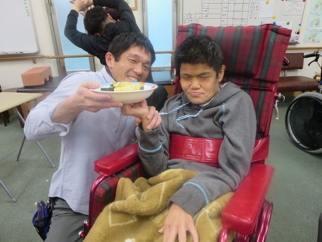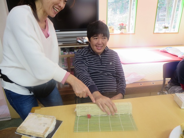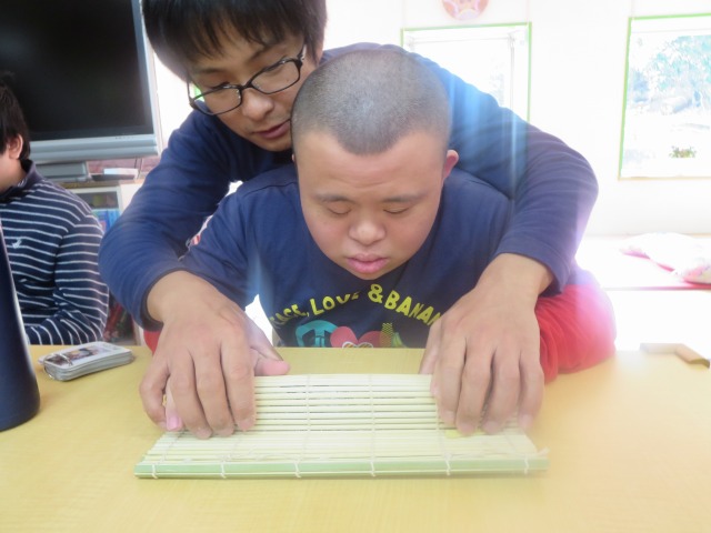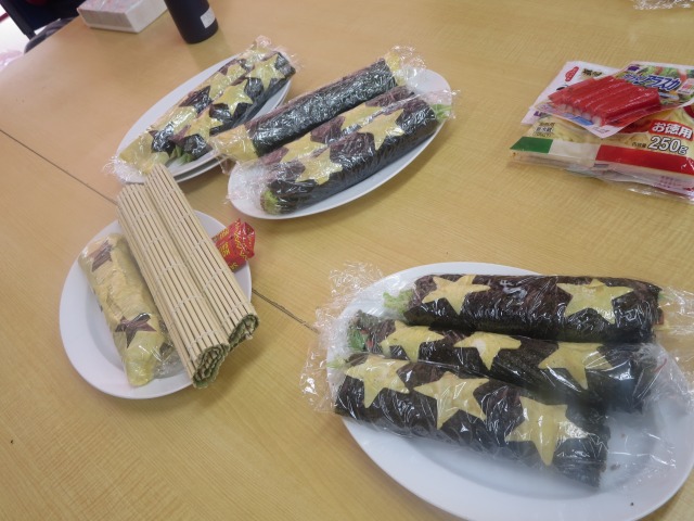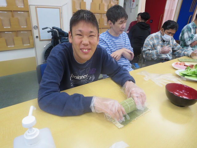 皆で恵方巻きを手作りしました。きゅうり、レタス、たまご、